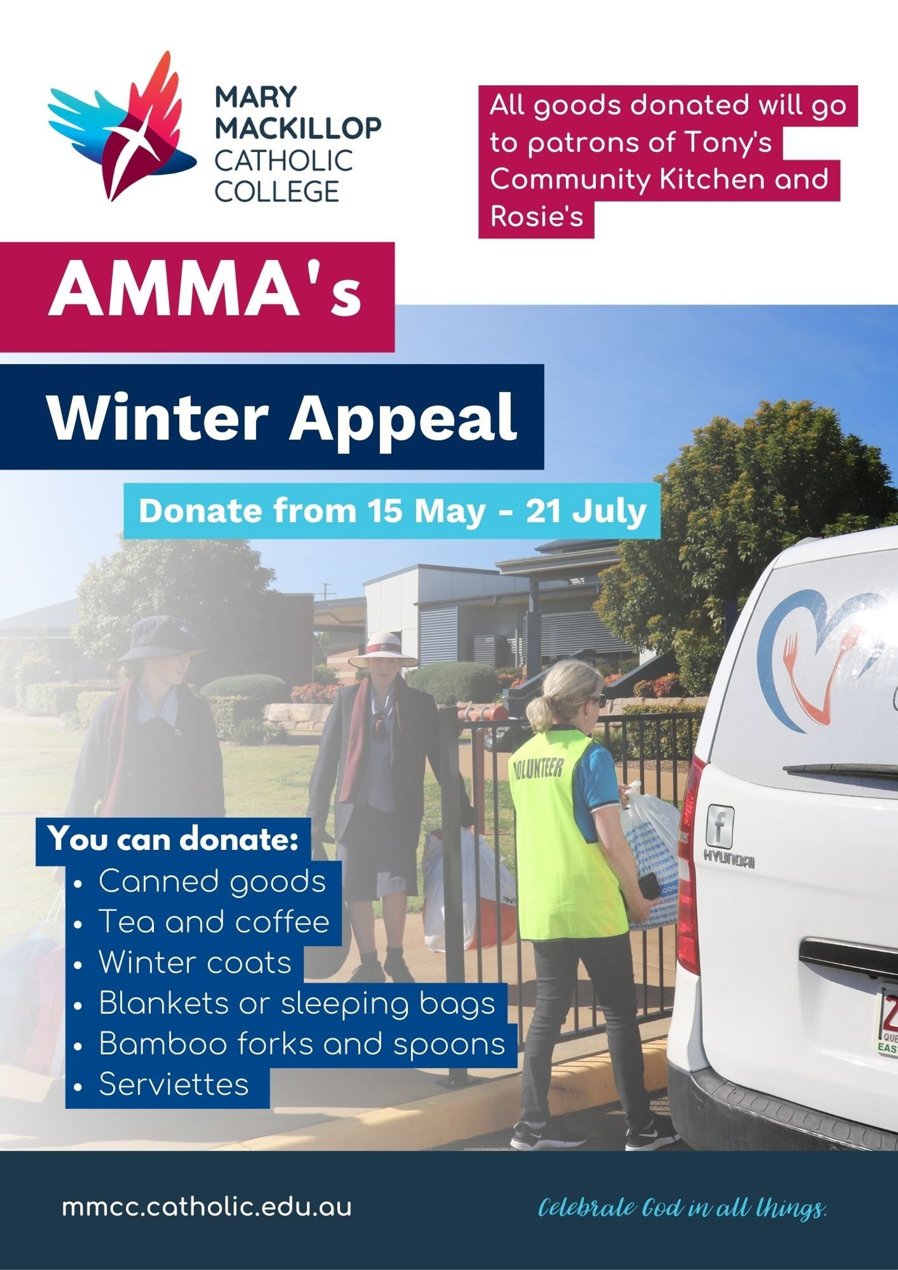 Starting from Week 5 this term, and running until Week 2 of Term 3, AMMA’s Winter Appeal will be calling for donations of: