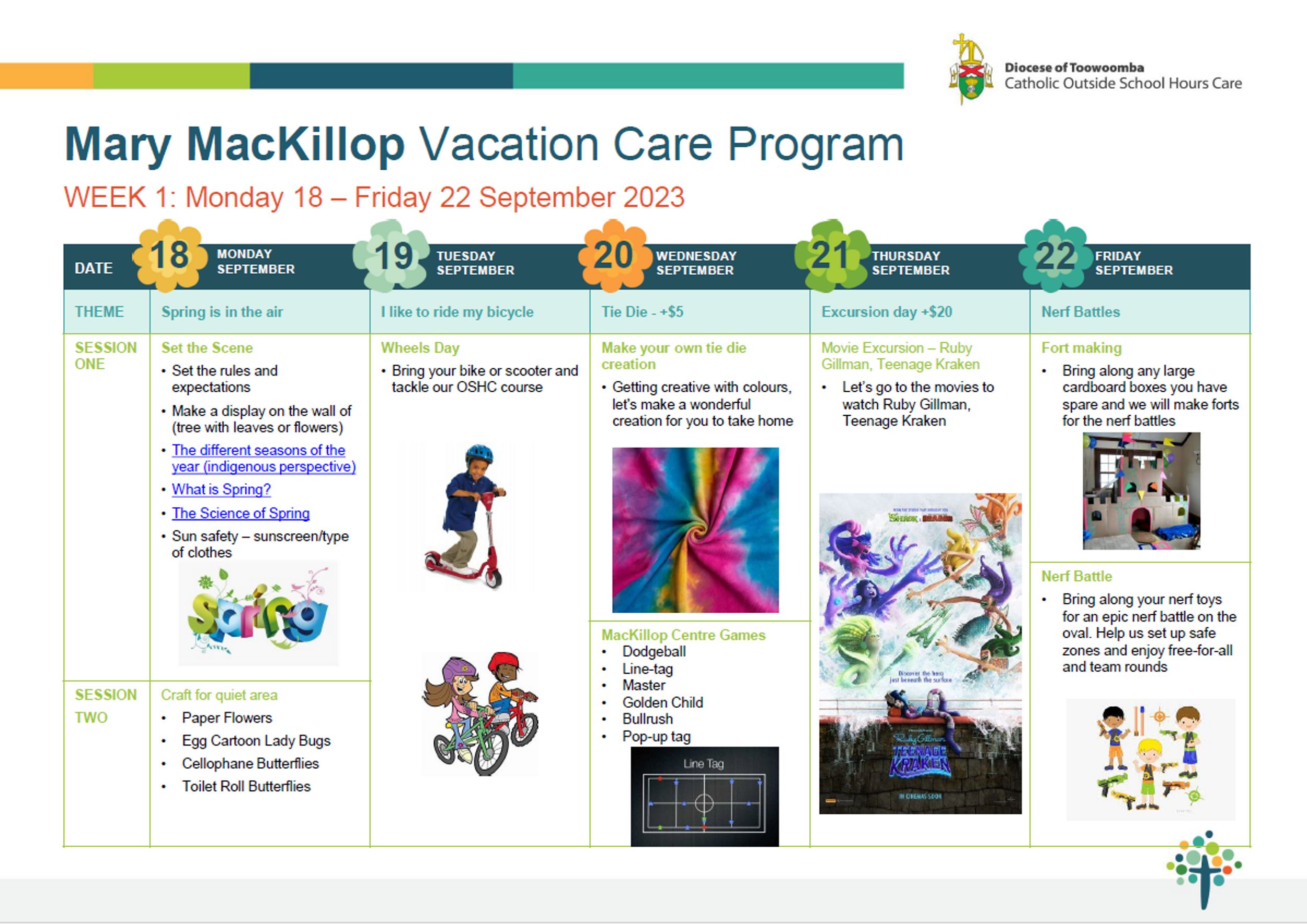 Our Spring Vacation Care Program has now been released! There are so many exciting activities planned these school holidays such as two excursions; one to The Strand to Watch the new movie Teenage Kraken, and the other to Cobb & Co Museum to walk through history, creating fortresses out of cardboard boxes than having a Nerf Gun battle, riding around the school on our bikes/scooters/rollerblades, colouring shirts/socks in with Tie Dye, creating our own Teddy Bear Pillows, then filling in their birth certificates, and so much more!